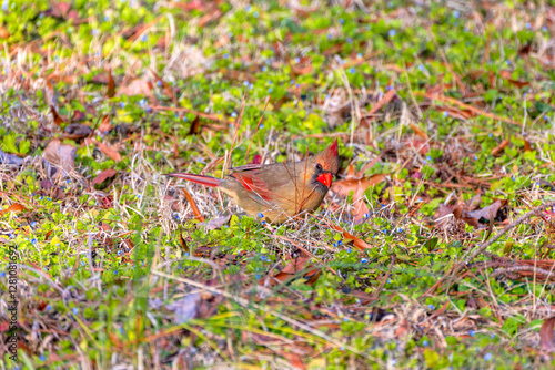 The Northern Cardinal (Cardinalis cardinalis) on a meadow