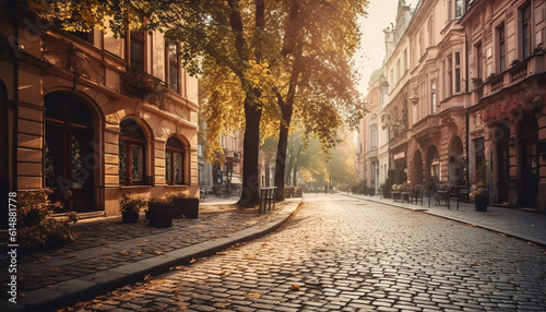 architecture, building exterior, built structure, dusk, autumn, old, city life, tree, night, famous place, city landscape, sunset, history, nature, window, sunlight, old-fashioned, travel, leaf, footpath, culture, vanishing point, sun, cobbled, tour tourism, sidewalk, city street, street light, summer, day, illuminated, car, season, lantern, travel destination, backlit, capital city, wall, residential area, stone, plant, brick, sunrise, dawn