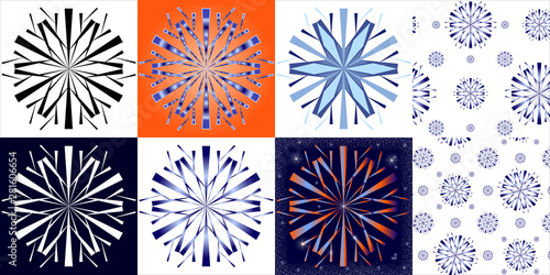 The original snowflake in the style of hand-drawing in 7 applications - icons, logo, seamless pattern. Elements for design on the theme of winter, cold, frost, space, creating a background, texture.