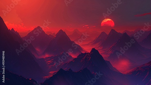 The outlines of rugged mountains bathed in the warm glow of red light, with the sky transitioning from red to purple as the sun sets. The atmosphere is ethereal and awe-inspiring