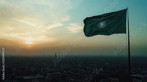 The Pakistan flag flowing gracefully with the wind, captured on a city skyline, in
