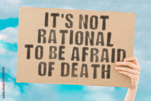 The phrase " It's not rational to be afraid of death " on a banner in men's hand with blurred background. End of life. Agreement. Document. Dead. Psychology