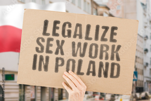 The phrase " Legalize Sex Work in Poland " is on a banner in men's hands with blurred background. Guide. Govern. Body. Coworker. Crime. Criminal. Democracy. Desire. Employee. Earnings. Dollars