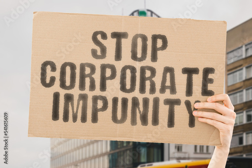 The phrase " Stop corporate impunity " is on a banner in men's hands with blurred background. Conflict. Difference. Variation. Favoritism. Distinction. Diversity. Corporation. Different. Employer