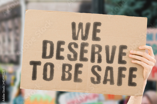 The phrase " We deserve to be safe " on a banner in men's hand. Human holds a cardboard with an inscription. Human rights. Punishment. Hate. Safety. Security