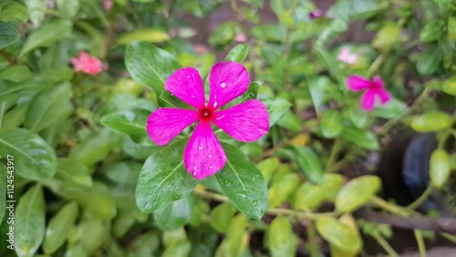 The pink petaled flowers bloom beautifully and beautifully, surrounded by green leaves. Cayenne Jasmine ,Periwinkle, Catharanthus rosea, Madagascar Periwinkle, Vinca (catharanthus) cora, Apocynaceae