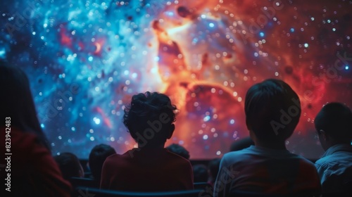 The planetarium dome lighting up with colorful visuals and vibrant constellations as a group of students watches a lively educational presentation on space.