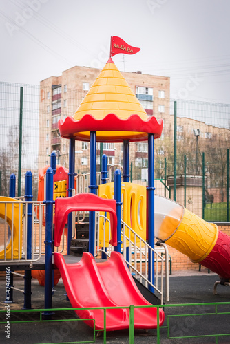 the playground is covered with a signal tape epidemic coronovirus COVID19. all small children are quarantined at home