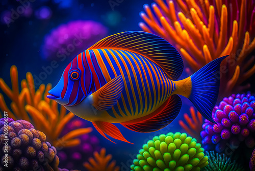The radiant Sailfin Tang swims elegantly in a coral reef, displaying its vivid hues against the backdrop