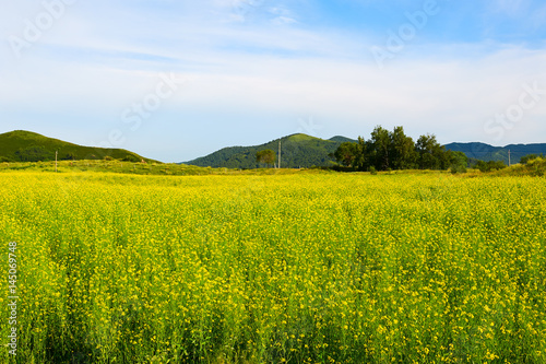 field, meadow, landscape, sky, grass, flower, agriculture, green, blue, yellow, summer, spring, farm, cloud, tree, flower, nature, cloud, countryside, rural, country, hill, environment, horizon, rape, springtime, meadow, steppe, prairie, china, highland, plateau, sunset, sunrise