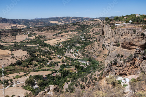The rocky, sheer-sided limestone cliffs of Ronda Gorge (El Tajo de Ronda) plummet 390 feet (120 meters) to Guadalevin River. Ronda, Province of Malaga, Spain.