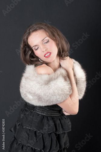 woman, beauty, fur, black, hair, portrait, young, girl, female, fashion, adult, face, beautiful, caucasian, glamour, model, person, 1, elegance, cute, colours, studio, clothing, sensuality, dark, background, hand, dress, brown