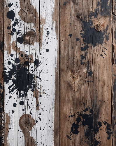 The rustic wood is divided into two horizontal panels, each showing a variety of paint splatters and stains in shades of white, black, and brown