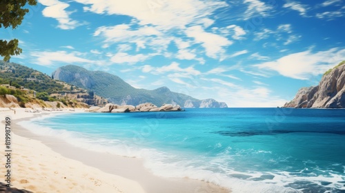 The scene shows a sunny day at the beach with waves crashing on the sand, creating a beautiful natural landscape by the water under a sky filled with clouds