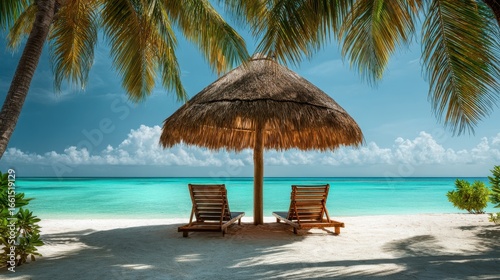 The serene beach scene with tropical chairs and a thatched umbrella.