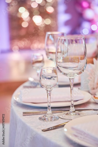 The setting of the festive table. Food and dishes. Festive glasses for drinks.