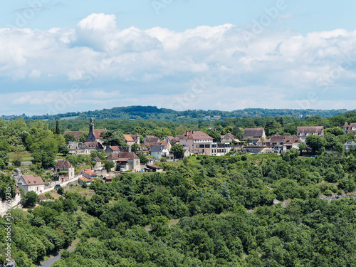 The settlement of l'Hospitalet above Alzou Canyon and Dordogne Valley, at the top of the Voie Sainte facing Rocamadour relics, way down the cliff face, seen from the Corniche promenade