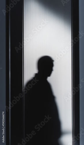 shadow, person, silhouette, abstract, minimalism, urban, modern, mysterious, contrast, monochrome, indoor, architecture, motion, symmetry, perspective, sleek, industrial design, city life, abstract art, anonymous, contemporary, simplicity, quiet, solitude, introspection, businessman, office, standing, dark, black