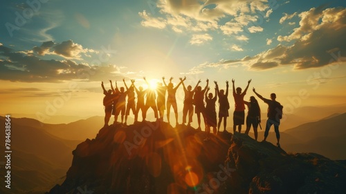 The silhouette of a large group against the setting sun on a mountaintop, their success pose reflecting a shared journey of endurance and triumph.