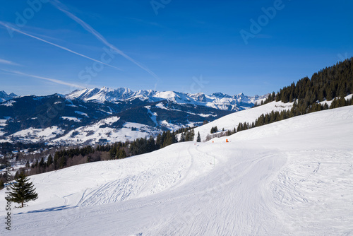 The ski slope in Megeve in Europe, France, Auvergne Rhone Alpes, Haute Savoie, Megeve, in summer, on a sunny day.