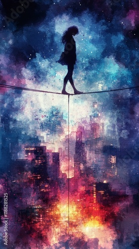 tightrope, night, symbolic, metaphor, danger, imbalance, risk, disorder, walking, instability, path, struggle, fear, fluid, transparent, washes, delicate, subtile, colours, watercolor, style, illustration, mobile, smartphone, portrait, vertical, background, desktop, wallpaper