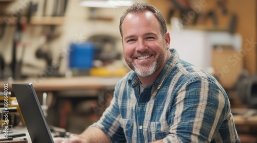 man, smiling, workshop, laptop, carpenter's shop, craftsman, casual attire, chequered, beard, happy, artisan, craftsmanship, tool, wood, professional, relaxed, male, portrait, indoor, working, expression, computer, creative, hobby, skilled, scene, environment, workspace, lifestyle
