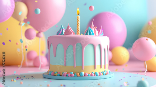 The smooth 3D-rendered cake in delicate pastel tones, topped with a single candle, showcases modern minimalism and elegance.