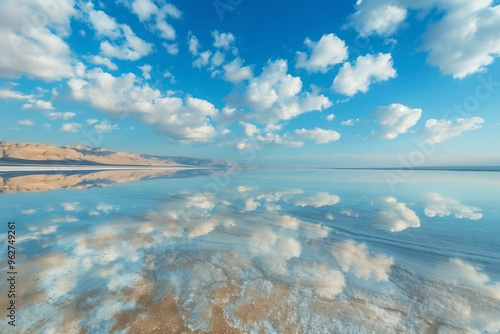 The smooth surface of the very salty sea water reflects the sky and clouds. Quiet windless winter day. Legendary Dead Sea. Israel