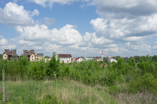 architecture, background, beautiful, beauty, blue, brick, bright, brown, building, cloud, bungalow, country, countryside, downtown, estate, field, grass, green, home, house, landscape, luxury home, modern, nature, nobody, outskirts, residential, rural, russia, sky, style, summer, traditional, tree, village, white