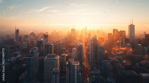 The sun sets behind the skyline, casting a golden glow over the towering buildings as the day transitions into night.