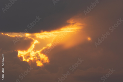 the sunset rays of the sun beautifully break through the clouds in the sky