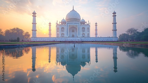 The Taj Mahal, a white marble mausoleum complex, reflects in a calm pool of water at sunrise. The iconic landmark is a popular tourist destination in India.