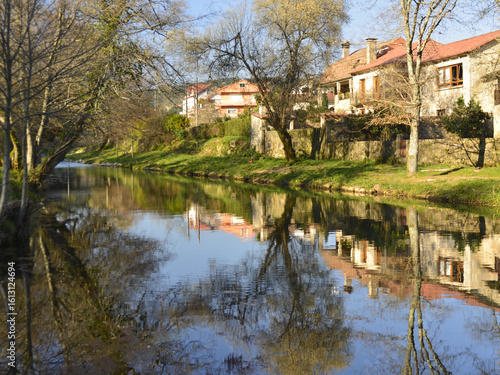 The Tamuxe River flowing serenely between beautiful houses in Galicia