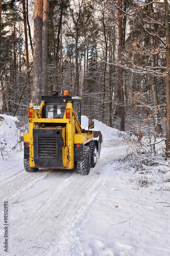 The tractor clears snow from the road