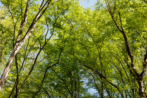 tree, green, sky, blue, tall, leaf, full, foliage, forest, nature, park, spring, sunny, environment, wood, summer, plant, landscape, background, tree branch, sunlight, day, beauty, view, light, up, trunk, bright, growth, scenic, colours, pine, sun, treetop, crown, season, through, bottom, ecology, upward, lush, below, looking, against, flora, growing, leafy, springtime