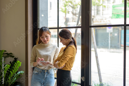 The two Asia use phone see content Social media Front window in coffee shop.