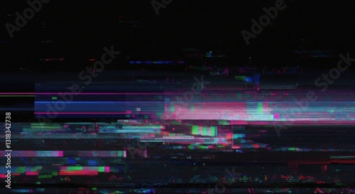 The vibrant color distortion in a glitch art composition with abstract pixel blocks and digital artifacts is set against a dark background