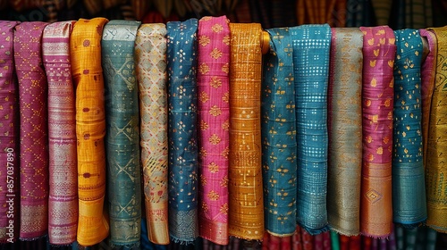 The vibrant colors and intricate designs of traditional Indian saris, displayed in a bustling market in Jaipur, offering a glimpse into the rich tapestry of Indian culture. Illustration, Minimalism,
