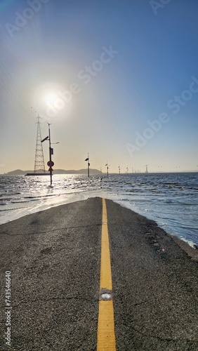 the view of the road submerged in the sea at high tide