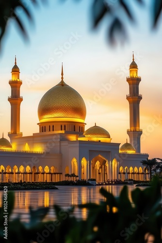 The wide shot of a mosque with detailed Islamic architecture