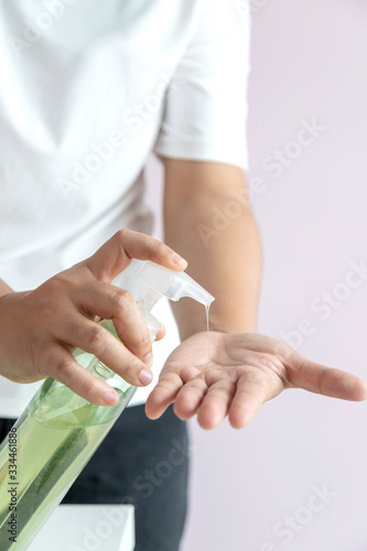 The woman squeezed the alcohol gel in a pump bottle into the palm