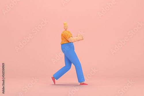 The woman with golden hair tied in a bun wearing blue corduroy pants and Orange T-shirt with white stripes. He is pulling or pushing something. 3d rendering of cartoon character in acting.