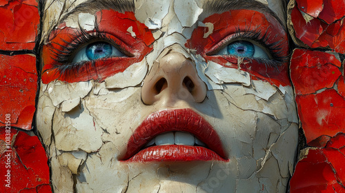 woman, face, make-up, art, beauty, cracked, surface, red, blue, eye, lipstick, expression, creative, texture, high-coloured, colours, cosmetic, portrait, skin, fashion, model, visual, detailed, striking, feature, eyebrow, surreal, artwork, detail, eye, contact, glam, industry, innovative, contemporary, artist, elegance, femininity, allure, captivating, paint, design, aesthetic, modern, inspiration, bold, emotional, facial, unique
