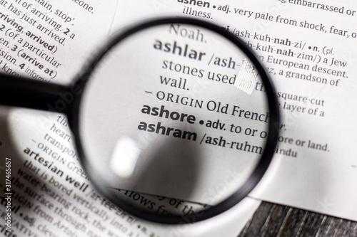 ashore, definition, dictionary, word, highlighted, marker, text, concept, conceptual, white, black, paper, page, editorial, illustrative, magnifying glass