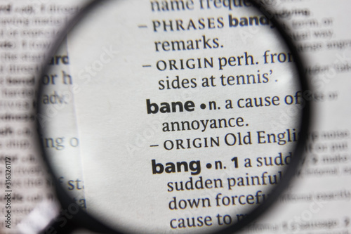 bane, definition, dictionary, word, highlighted, marker, text, concept, conceptual, white, black, paper, page, editorial, illustrative, magnifying, glasses