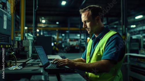 factory, men at work, technology, laptop, workplace, manufacturing, industry, concentration, safety, equipment, modern, team, productivity, engineering, male, adult, workspace, innovation, analysis, computer, protocol, operation, night, business, industrial, law, glove, green, casual attire, construction