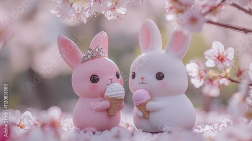 the world's smallest pink rabbit and a white rabbit, holding an ice cream in their hands, the background is under the cherry blossom tree, the blurry