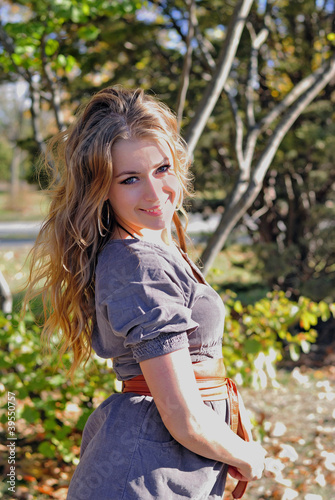 young, beautiful, smile, sit, to look, autumn, foliage, wood, tree, season, sun, hair, natural, long, sunburn, solar, pleasure, rest, nature, oneness, heat, sunbathe, portrait