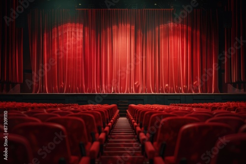 Theater stage with red velvet curtains and rows of seats for audience in front view.