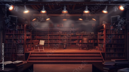 stage, library, theatre, spotlight, performance, book, shelf, platform, drama, event, interior, wooden, auditorium, hall, architecture, lighting, commercial, background, banner, template, website, marketing, advertising, design, presentation, education, literature, cognition, academic, study, dark, atmosphere, cinematic, indoor, dramatic, shadow, space, creative, venue, classic, culture, history, learning, inspiration, travel